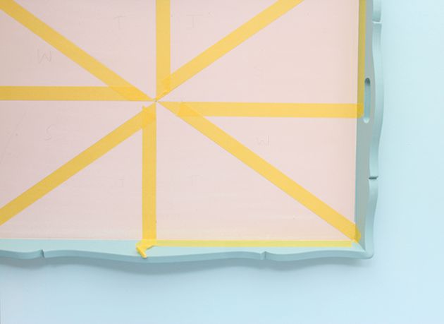Krok trzeci: przy pomocy linijki i ołówka maskującej utwórz na dnie tacy pola, jak na powyższym zdjęciu – na wzór pokrojonego tortu. Dwa z nich zostaw w beżowym kolorze, na pozostałych zastosuj naprzemiennie trzy inne pastelowe odcienie.
